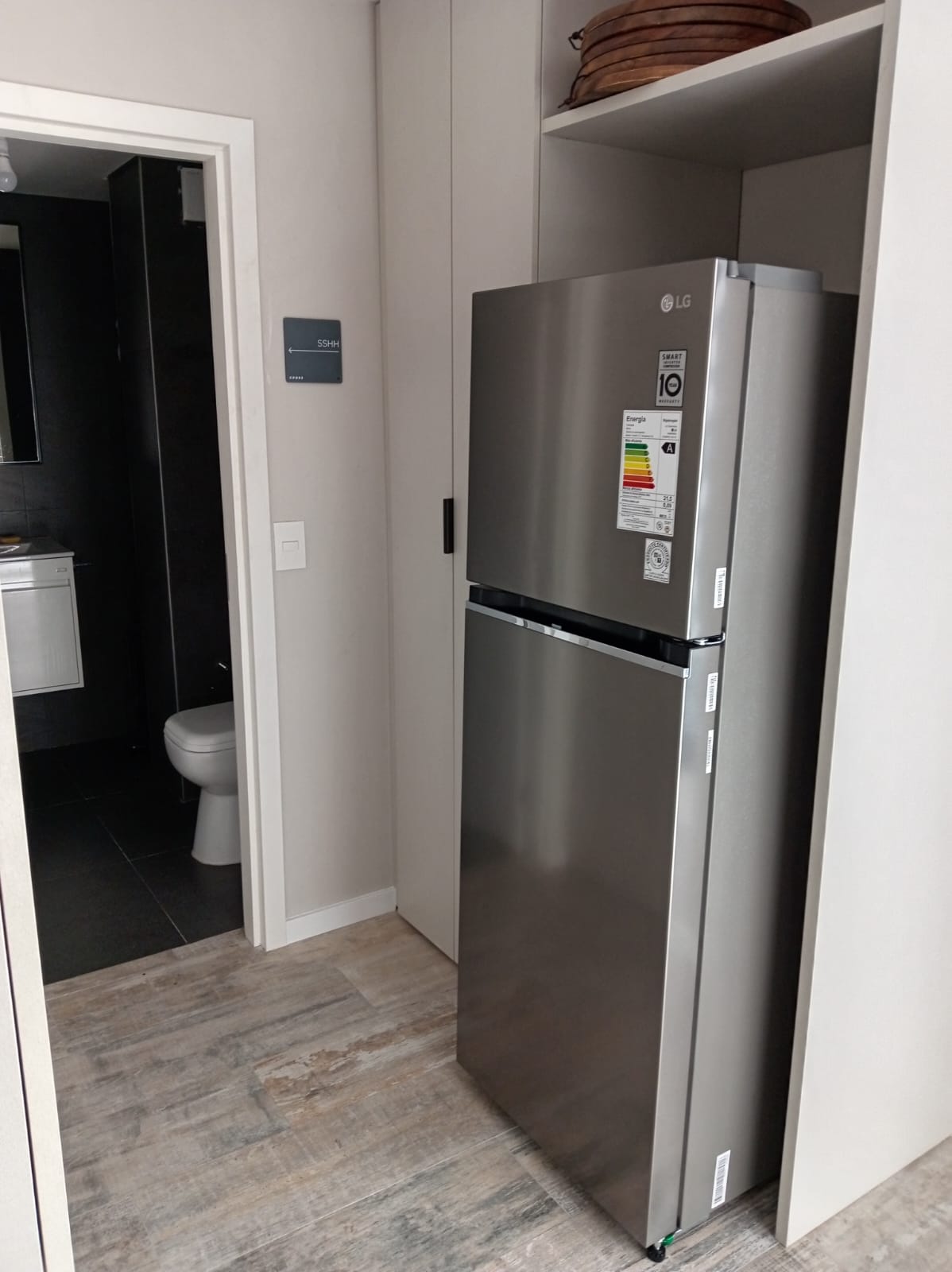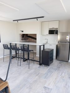 Cocina integrada con barra desayunadora, placares aéreos, bajo mesada y totalmente equipada (heladera, anafe, horno, microondas).
