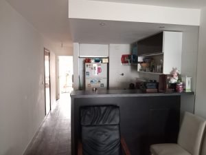 Cocina integrada con desayunador, placares aéreos y bajo mesada.