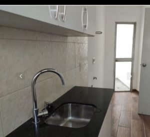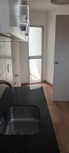 Cocina con placares aéreos y bajo mesada con salida a pequeña terraza.